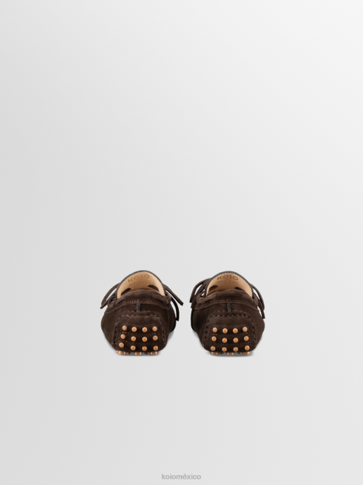 Tomamos nuestro mocasín maranello característico y lo transformamos con un simple lazo y cordones a lo largo del cuello. Confeccionado a mano en Italia con ante italiano espresso y completamente forrado con cuero suave para mayor comodidad, está detallado con costuras expuestas a mano y asentado sobre una suela gommini de goma flexible.